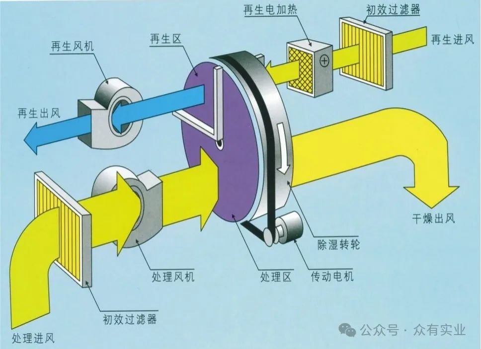 轉(zhuǎn)輪除濕機通常有兩個風路:處理風(干空氣)和再生風(濕空氣)。處理風是需要被除濕的空氣,再生風是用于再生吸濕輪的空氣。