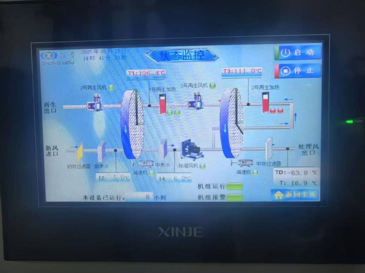 針對嵐圖的技術需求,眾有研發團隊創新采用三級除濕工藝:首級預冷除濕將空氣含濕量降低60%,二級轉輪吸附實現-45℃露點深度脫水,三級冷凝強化確保最終露點穩定在-64.2℃。其中,核心部件蜂窩硅膠轉輪采用納米級疏水涂層技術,吸附效率較傳統材料提升40%;再生系統搭載智能變頻加熱模塊,能耗較行業平均水平降低25%。該設備在20/60%RH工況下,除濕量達400L/h,溫濕度波動范圍±0.3/±3%RH,綜合性能指標優異。