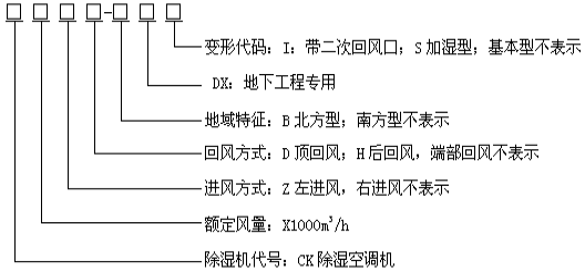 型號示例: CK12-DX 表示名義風(fēng)量為12000m3/h,回風(fēng)方式為端部回風(fēng)的南方型地下工程用除濕空調(diào)機,面對機組控制器,回風(fēng)口在右側(cè)。