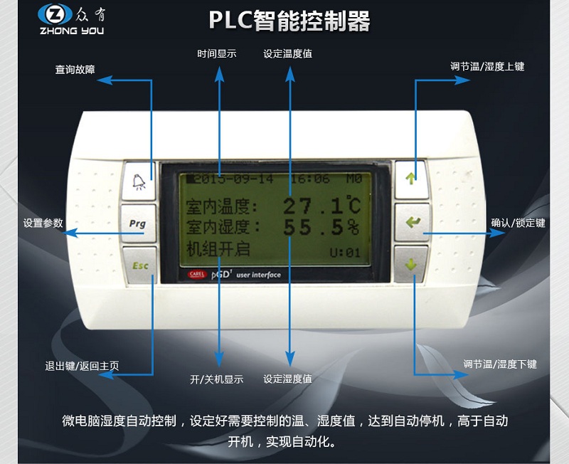 1. 采用國際品牌可編程PLC控制器,獨有的微電腦智能全自動控制系統(tǒng),用戶只要設(shè)定好所需的溫濕度控制范圍,機組即自動判斷運行負荷進行能量調(diào)節(jié),按最經(jīng)濟的運行模式自動運行,節(jié)約了運行費用;控制器預留遠程控制接口,可方便用戶遠程集中控制,節(jié)省管理。