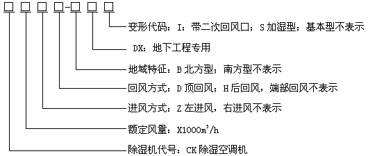 型號(hào)示例: CK12-DX 表示名義風(fēng)量為12000m3/h,回風(fēng)方式為端部回風(fēng)的南方型地下工程用除濕空調(diào)機(jī),面對機(jī)組控制器,回風(fēng)口在右側(cè)。